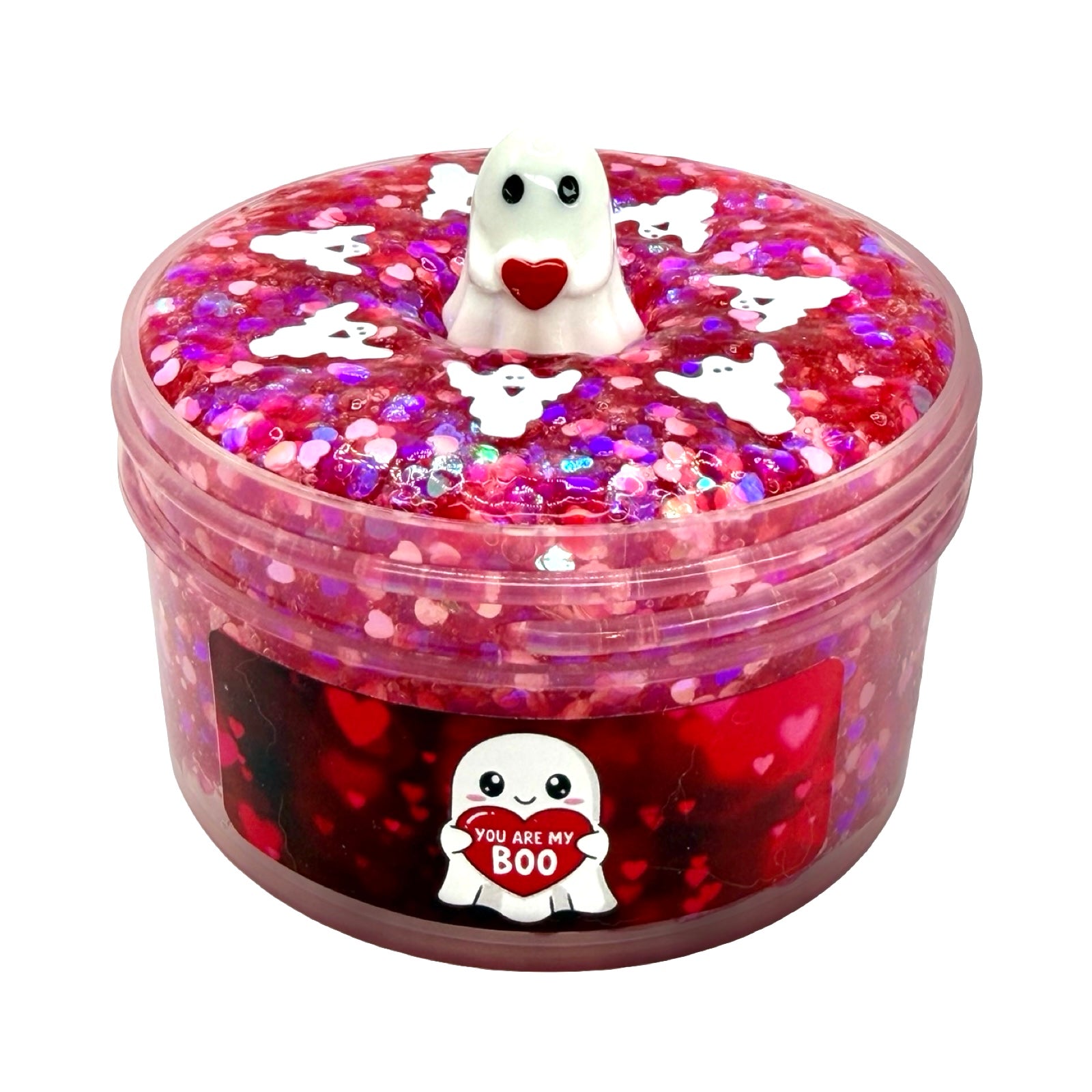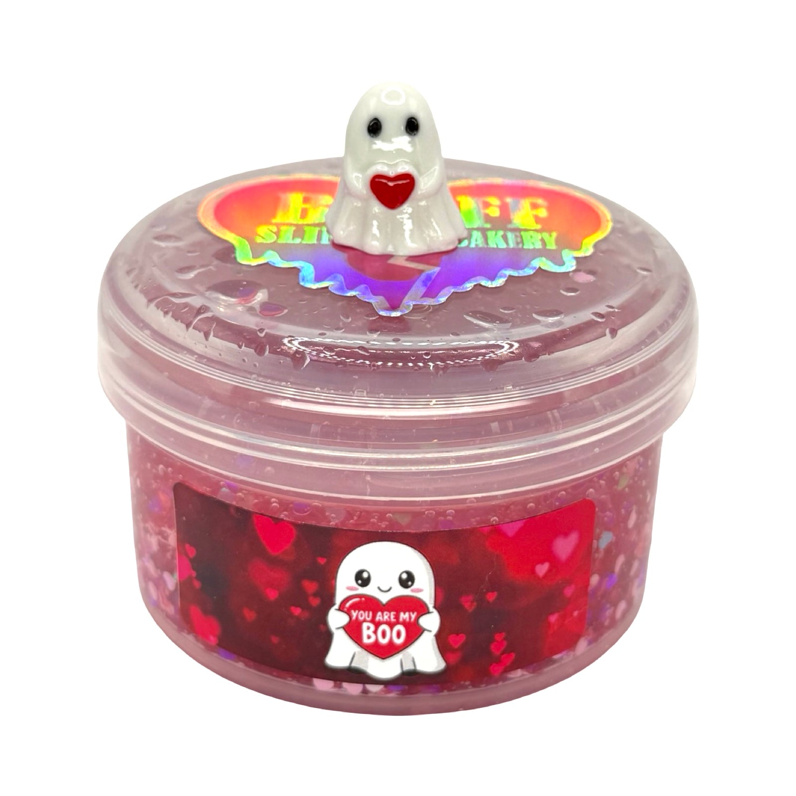 Topped with a cute ghost holding a heart charm and a sprinkle of ghost glitter, this slime is simply gorgeous to look at and adore. It’s smooth and satisfying to squish, makes nice firm pops, and has that irresistible stretchy texture we love. 💖