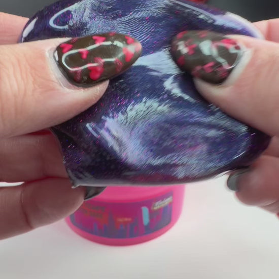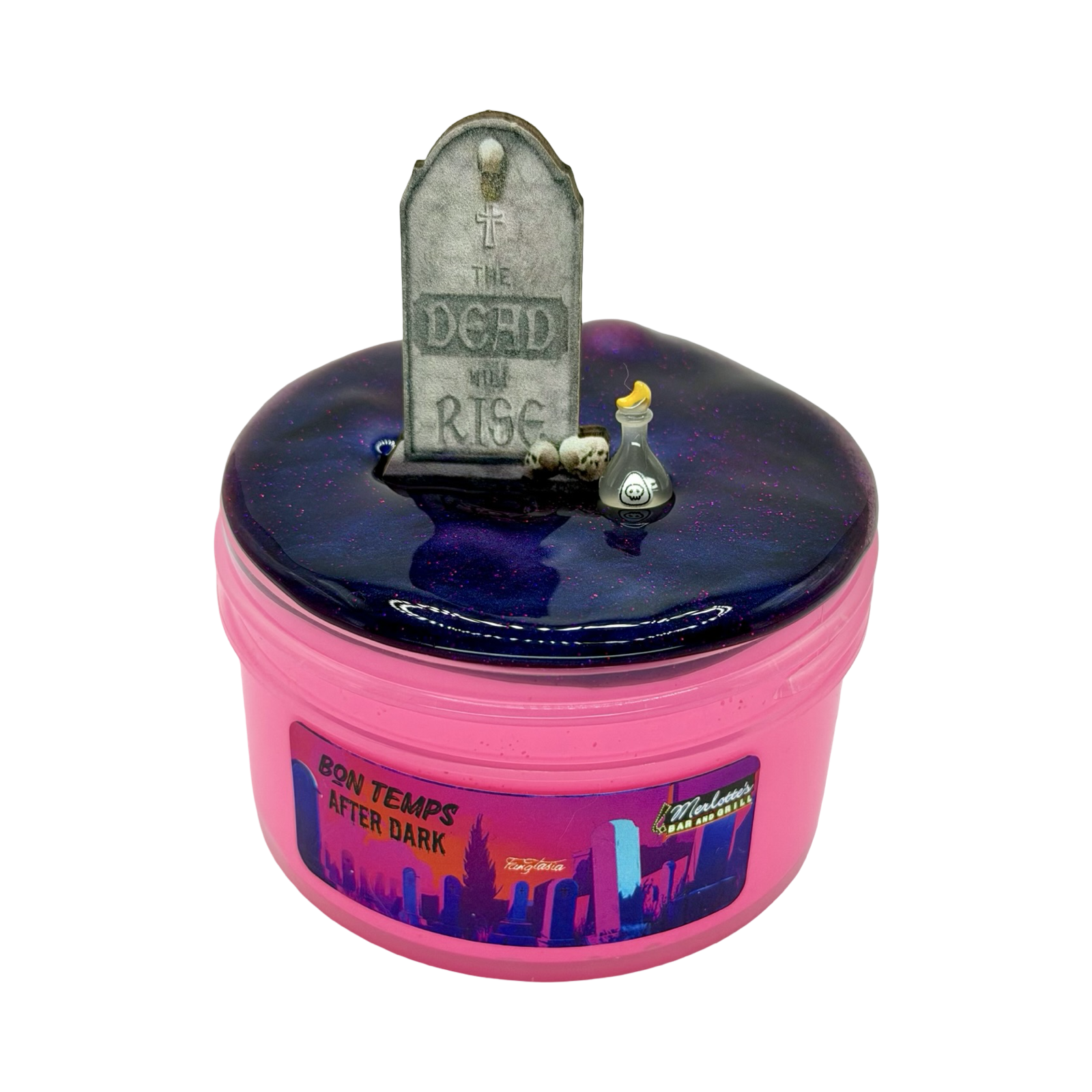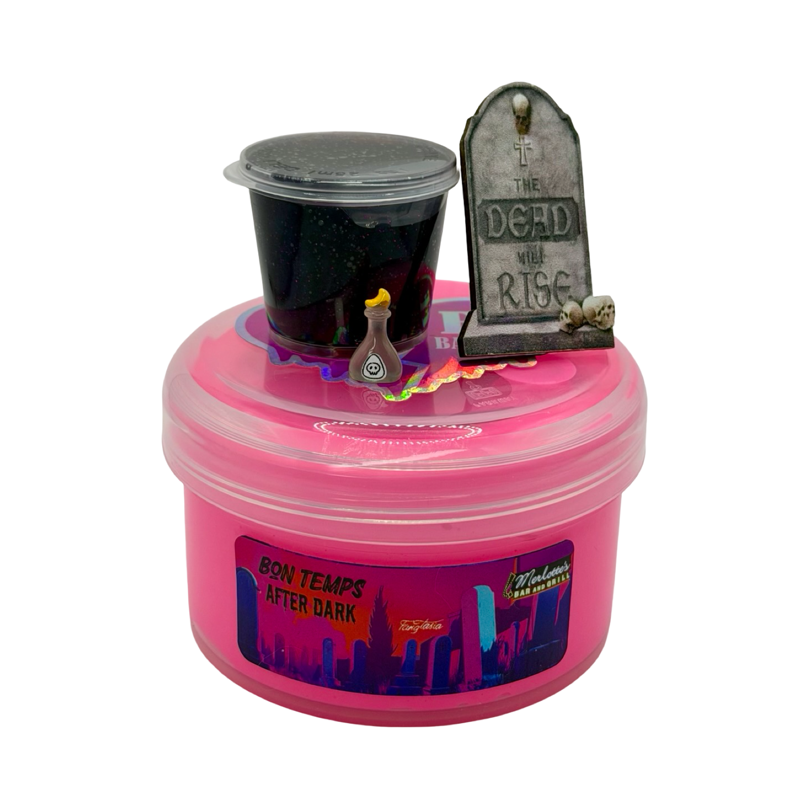 This slime features a vibrant neon pink Korean jiggly base topped with a shimmering midnight coated clear slime that drizzles like starlight over the bayou at night. Together, they create a stunning contrast of bright Southern charm and dark supernatural allure. Scented in a mouthwatering blend of warm New Orleans beignets dusted in sugar and bright, juicy blood orange, this slime is the perfect mix of sweetness and bold citrus. Each slime comes with a mini gravestone charm (a playful nod to Sookie’s late-night graveyard strolls), and a voodoo bottle (all styles will vary).