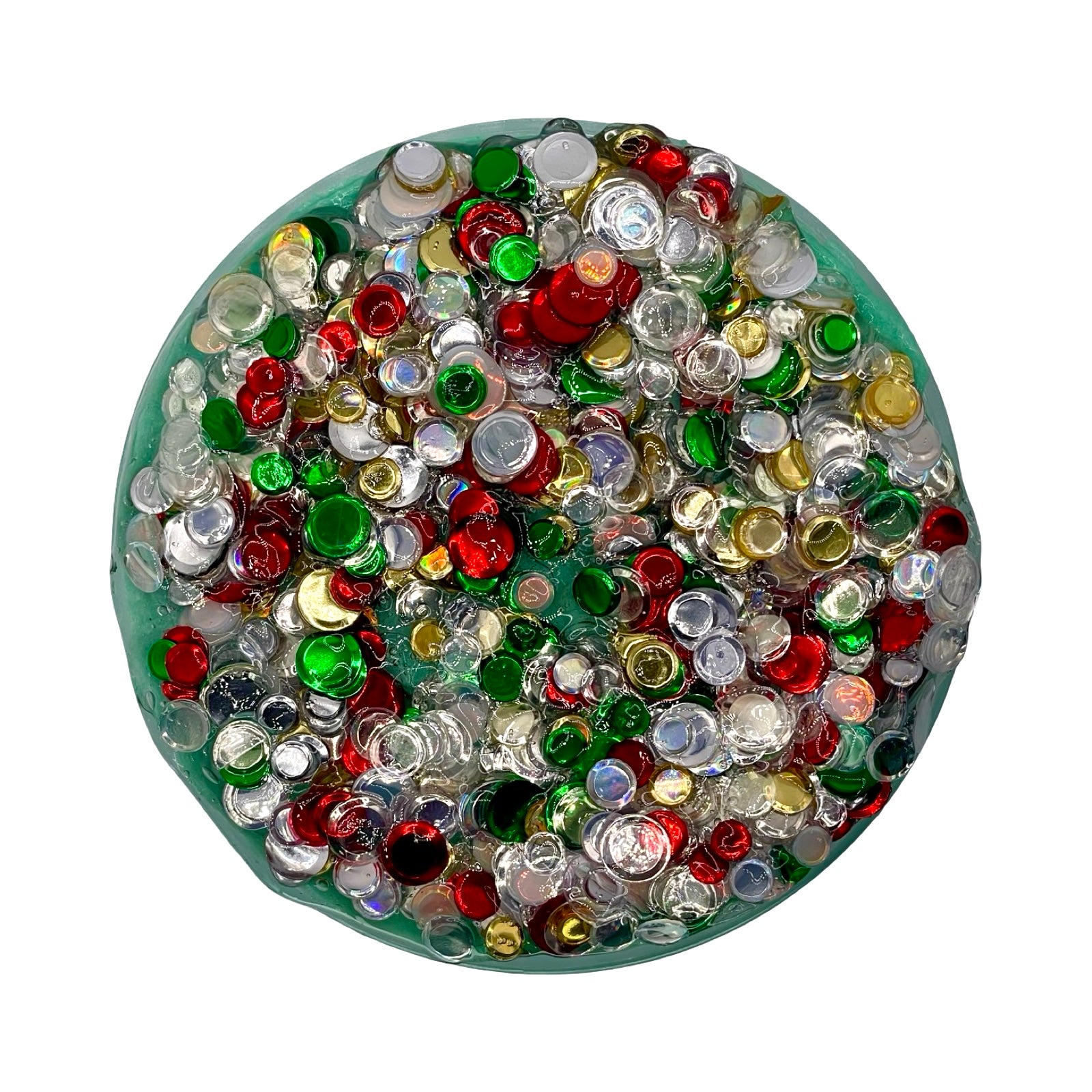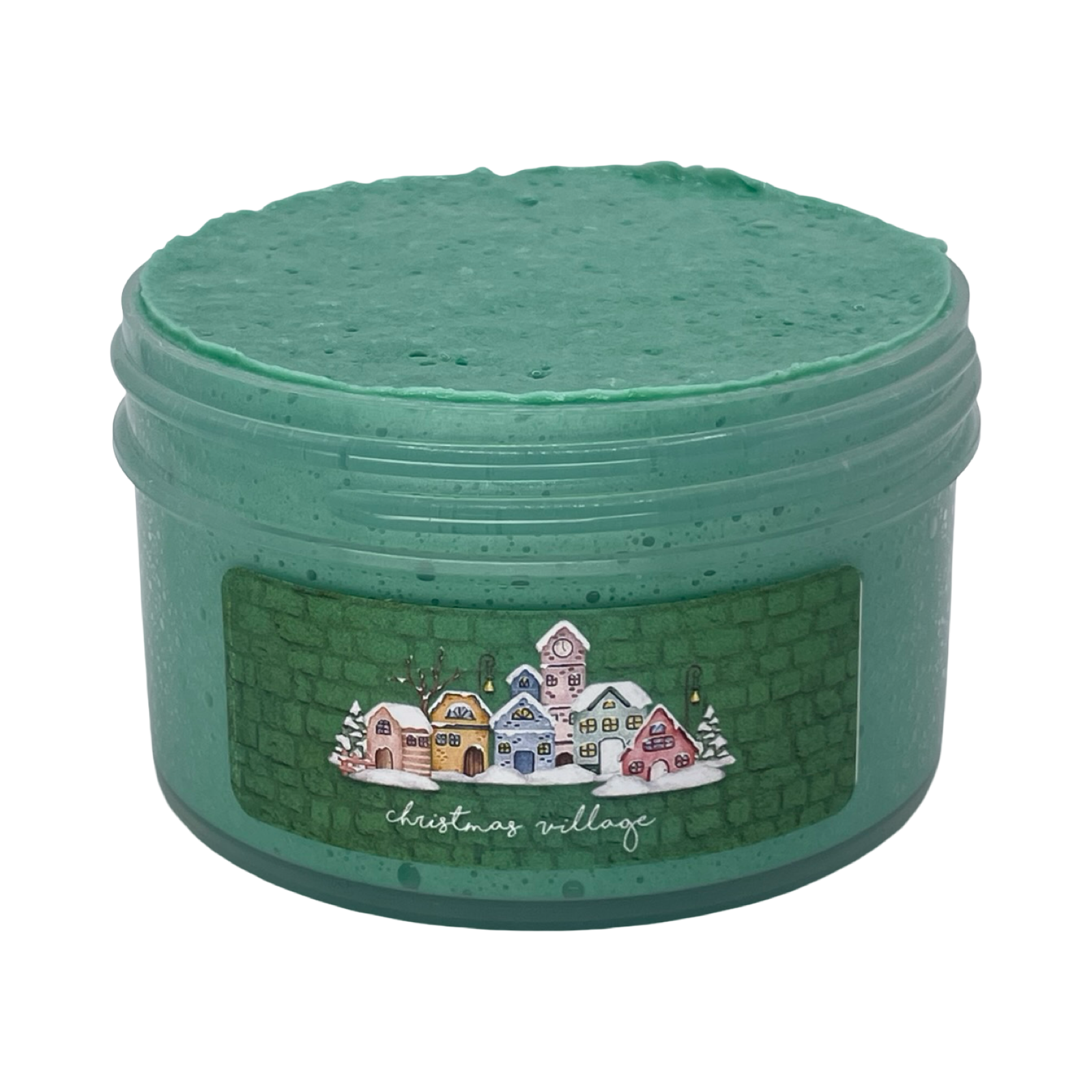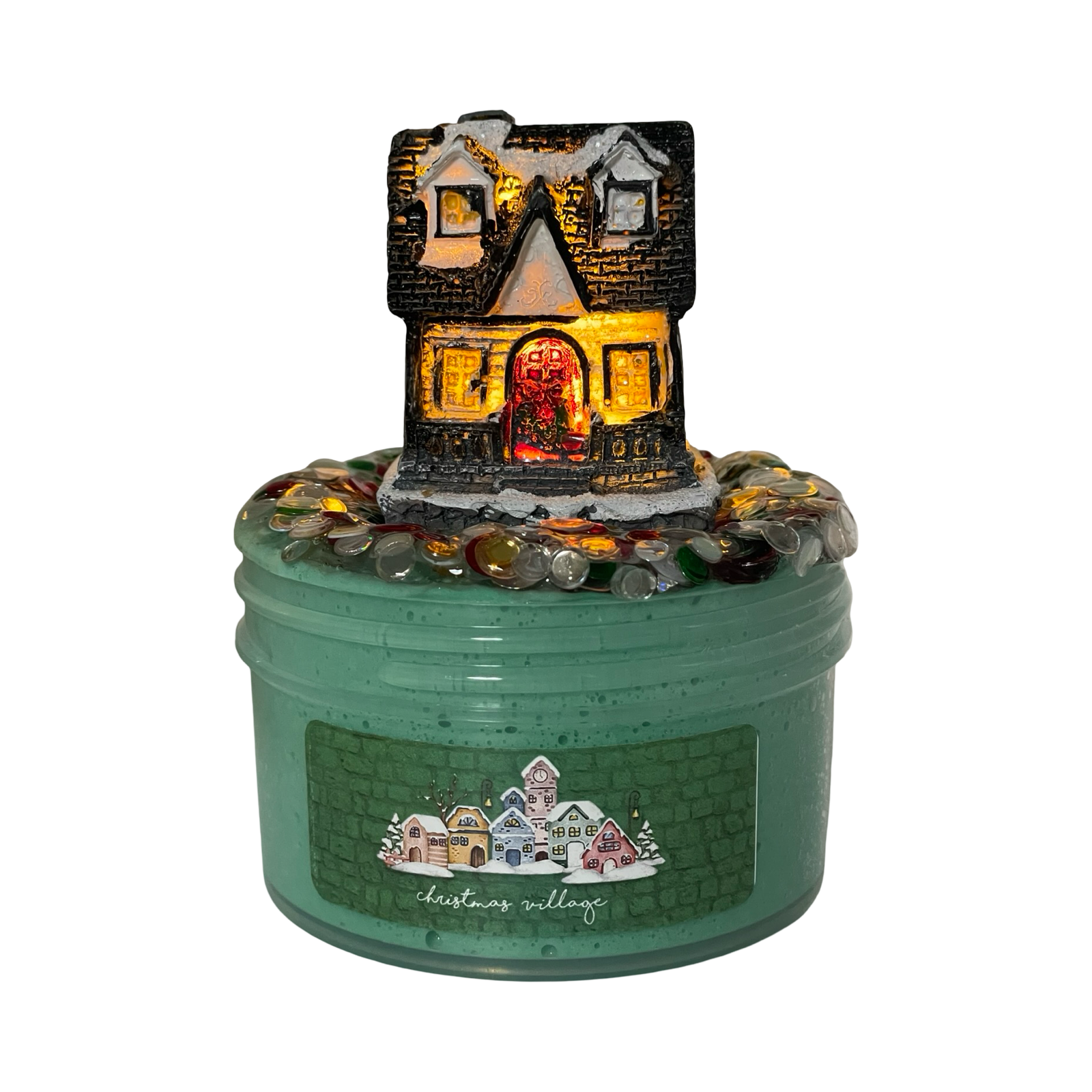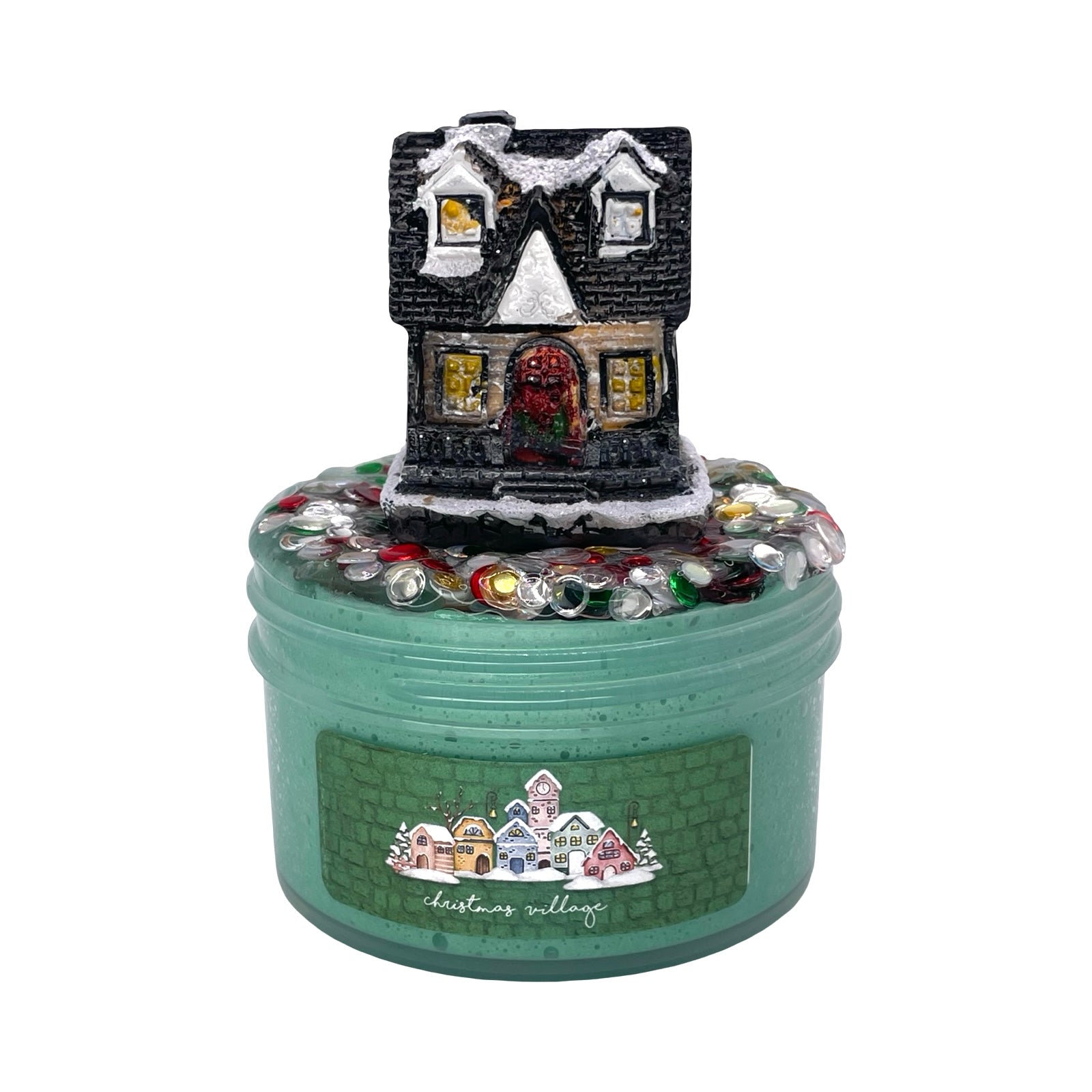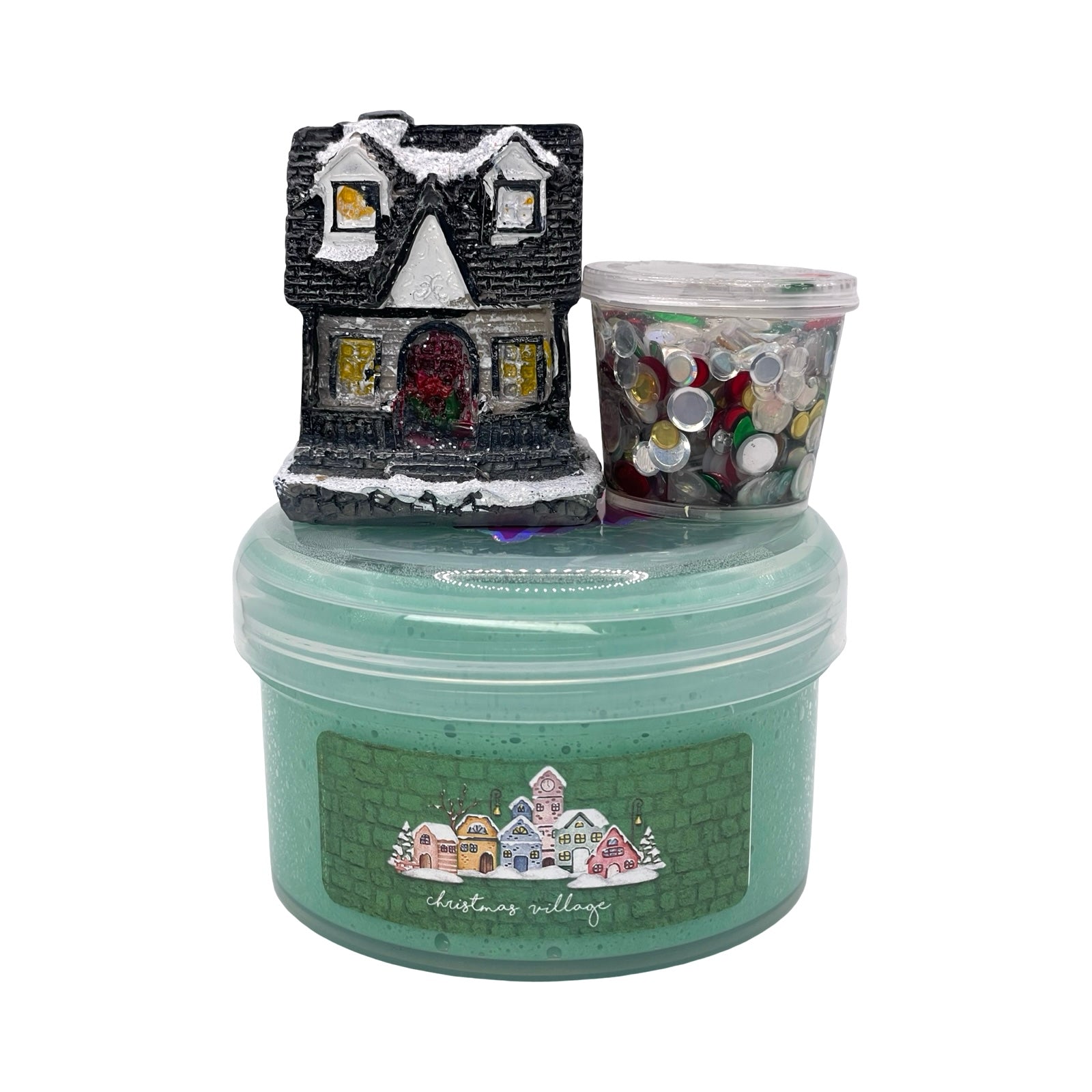 Create your own cozy holiday scene with Christmas Village, a deep green paper pulp slime filled with a festive mix of Christmas disc sequins. Scented with warm notes of banana, sweet bread pudding, and nutmeg, it brings nostalgic winter bakery vibes to every jar. Each slime comes with an adorable mini Christmas cottage that lights up, making it the perfect centerpiece for your holiday collection.