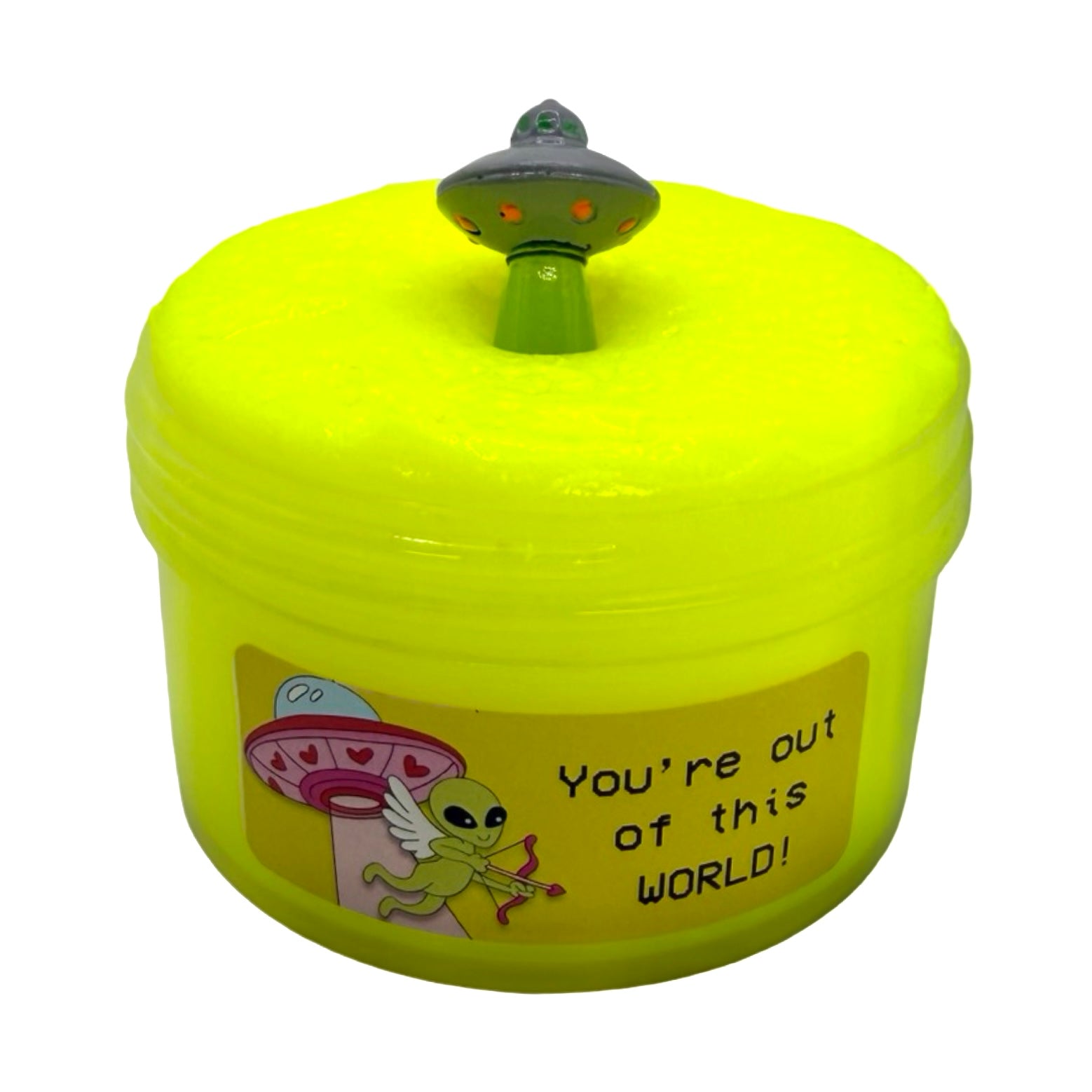 Our signature latex texture gleams in a bold, bright, neon yellow. Scented like a cloud of pink yuzu, sugar blossom, and fluffy vanilla foam, this slime will make even the slickest swell weak in the knees. Each slime comes with a spaceship charm, ready to launch your heart into orbit at warp speed!