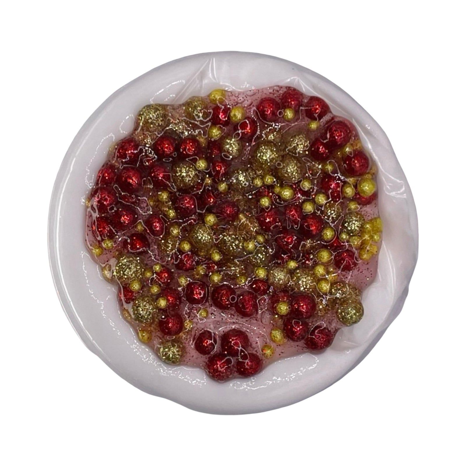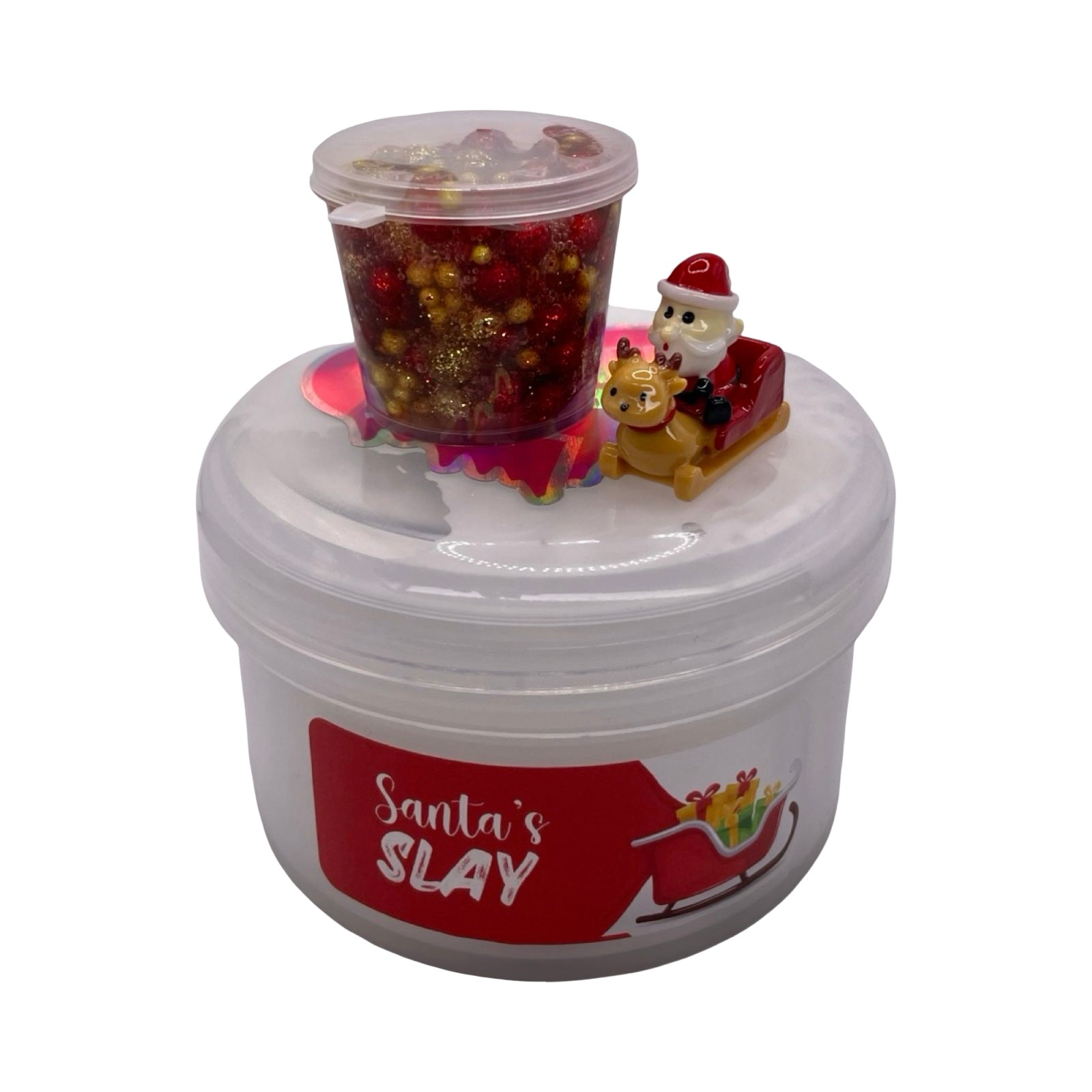 Get festive with Santa’s Slay, featuring a smooth white slay base topped with a sparkling red and gold floam that shimmers like Christmas tree ornaments. Scented with cinnamon, vanilla, sugar, and butter, it’s a sweet and cozy holiday treat in a jar. Each slime comes with a miniature sleigh and Santa charm to complete the festive magic.