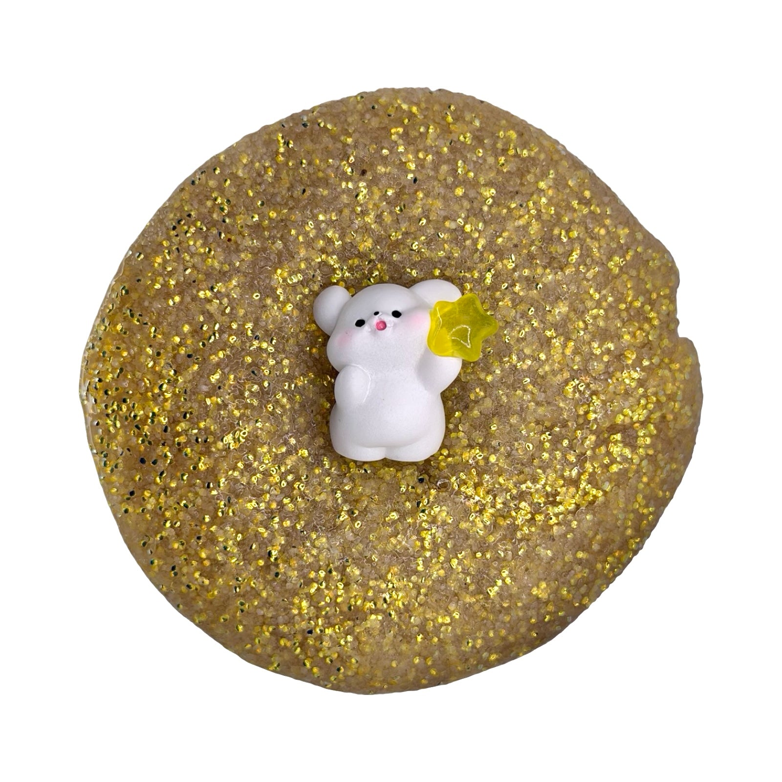 This dreamy slime features a pale yellow butter base that’s soft, plush, and ultra-smooth to stretch. The base is topped with a sparkling sugar sand and microsequin blend, adding a delicate crunch and celestial shimmer that melts beautifully as you mix. The scent is a rich baklava-inspired blend, layered with notes of pistachio, flaky pastry, and golden honey. Each slime comes with a cute bear star charm (styles will vary).