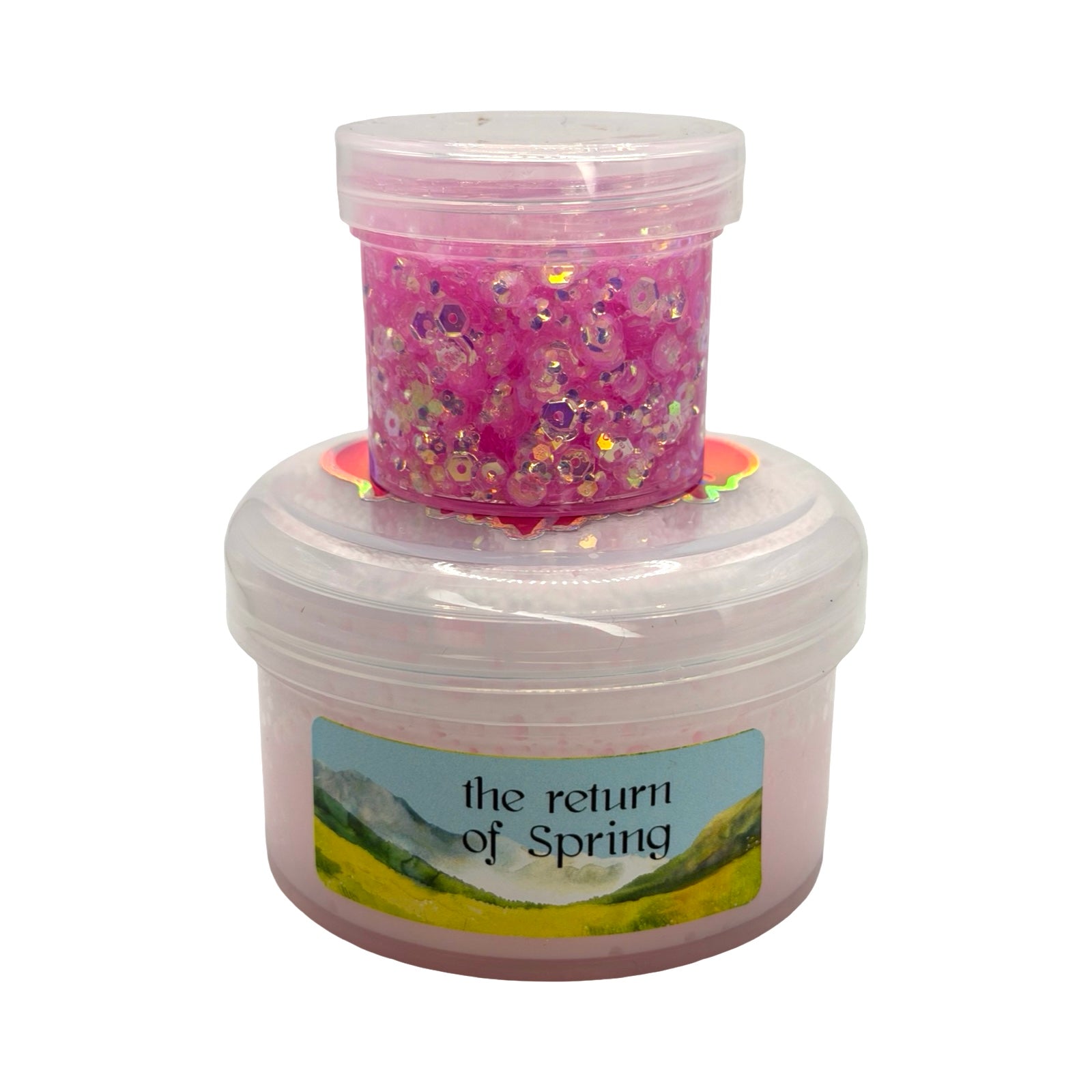 This petal pink white-glue floam base is soft and plush, with gentle crunch from the foam beads that feels light and uplifting. Finished with a sparkling flower sequin topper, it symbolizes new life and the promise of warmer days ahead. The scent blooms with delicate pear, nectarine, jasmine, and gardenia, softened by Tahitian vanilla, with a touch of cashmere woods and sandalwood for warmth.